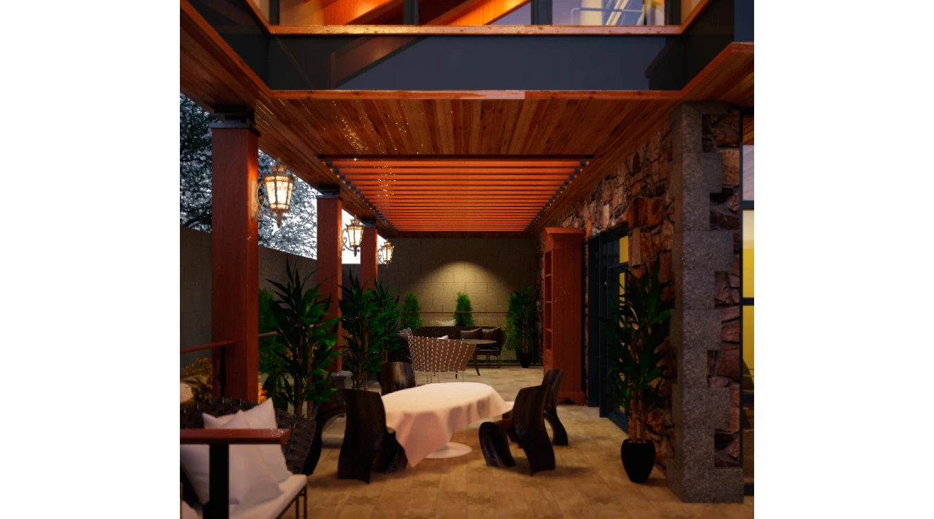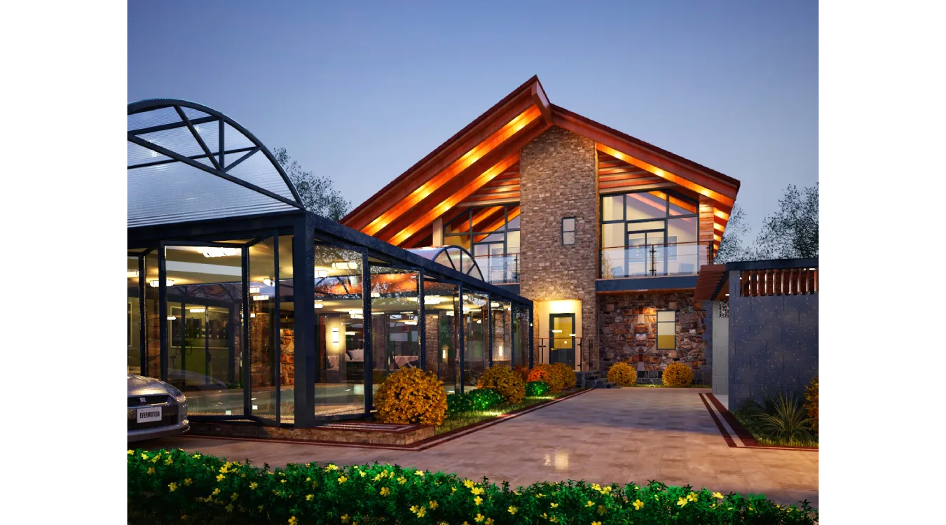 • Üslub Sintezi : Layihə sadə həndəsi formaları (müasir üslub) təbii materiallarla (daş, taxta) işlənmiş fasadla birləşdirir. Rustik və modern üslubun bu harmoniyası tikiliyə xüsusi istilik və cazibədarlıq verir.