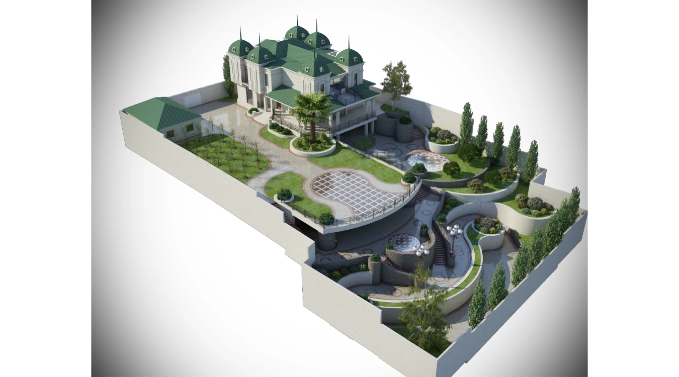 Evin əsl fərqləndirici cəhəti, mürəkkəb relyefə uyğunlaşdırılmış və diqqətlə düşünülmüş çoxsəviyyəli həyət dizaynıdır. Bu villa, həm şəhər həyatının müasir komfortunu, həm də klassik zərifliyin əzəmətini özündə birləşdirən, lüks ailə yaşamı üçün ideal bir məkandır.